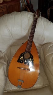 … a strange shaped 8-string mandolin with a pear shaped body and long scale length.The instrument was unplayable until a local luthier John Roberts replaced the neck and the instrument was strung up and tuned as an Octave Mandola.